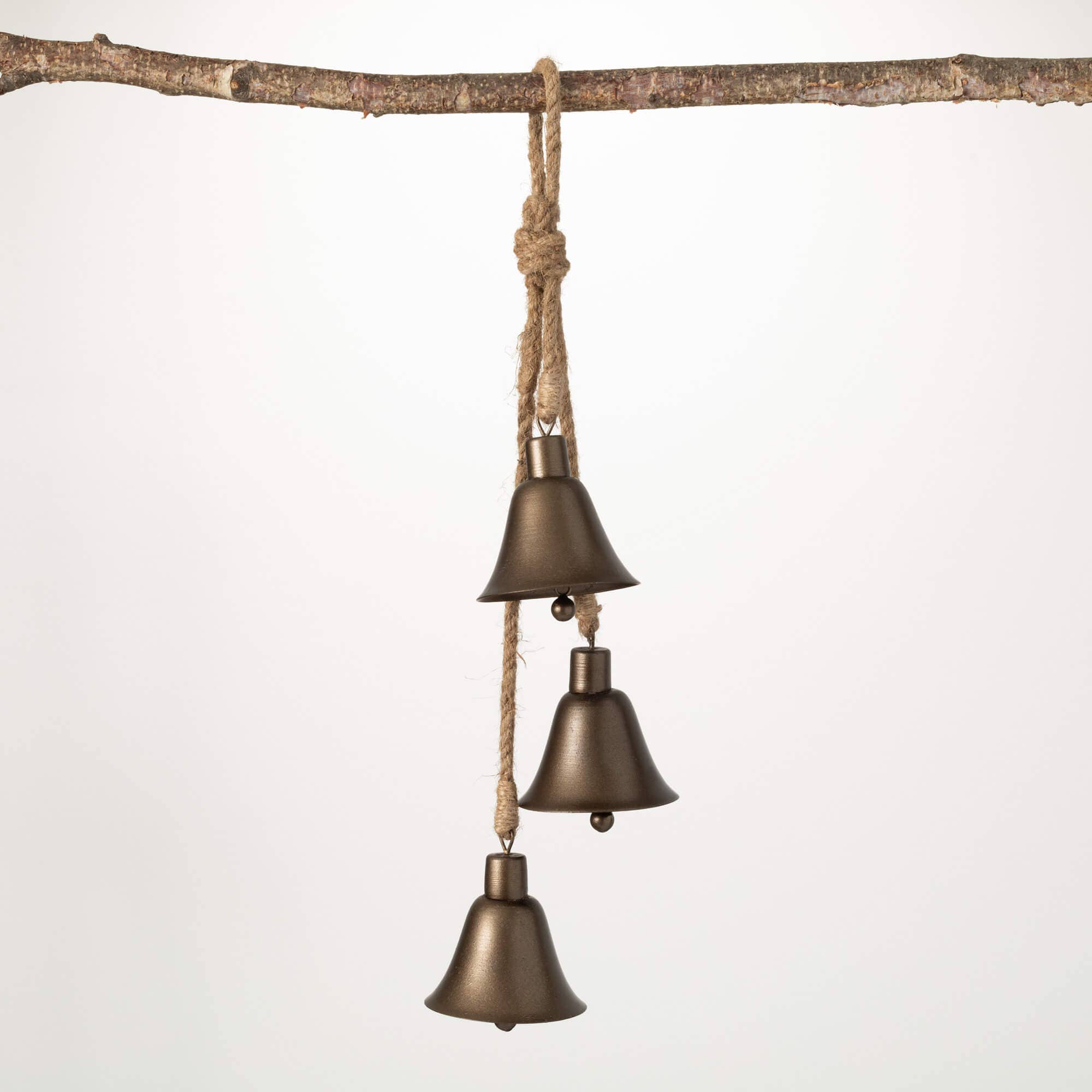 This rustic bell swag features three sleek bells with a powder bronze finish strung on a weathered rope. Versatile enough to compliment a variety of decorating styles, these bells are also neutral enough to remain on display through out the winter months.