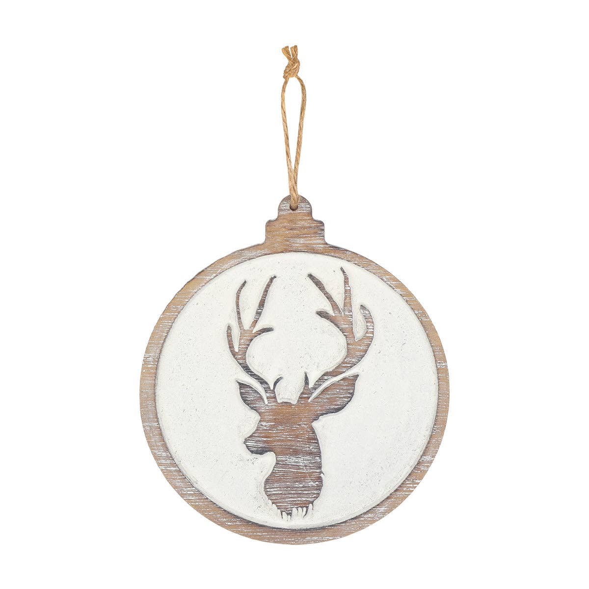 Circular wood ornament with white background, wood colored deer with antlers design, and jute string to hang.