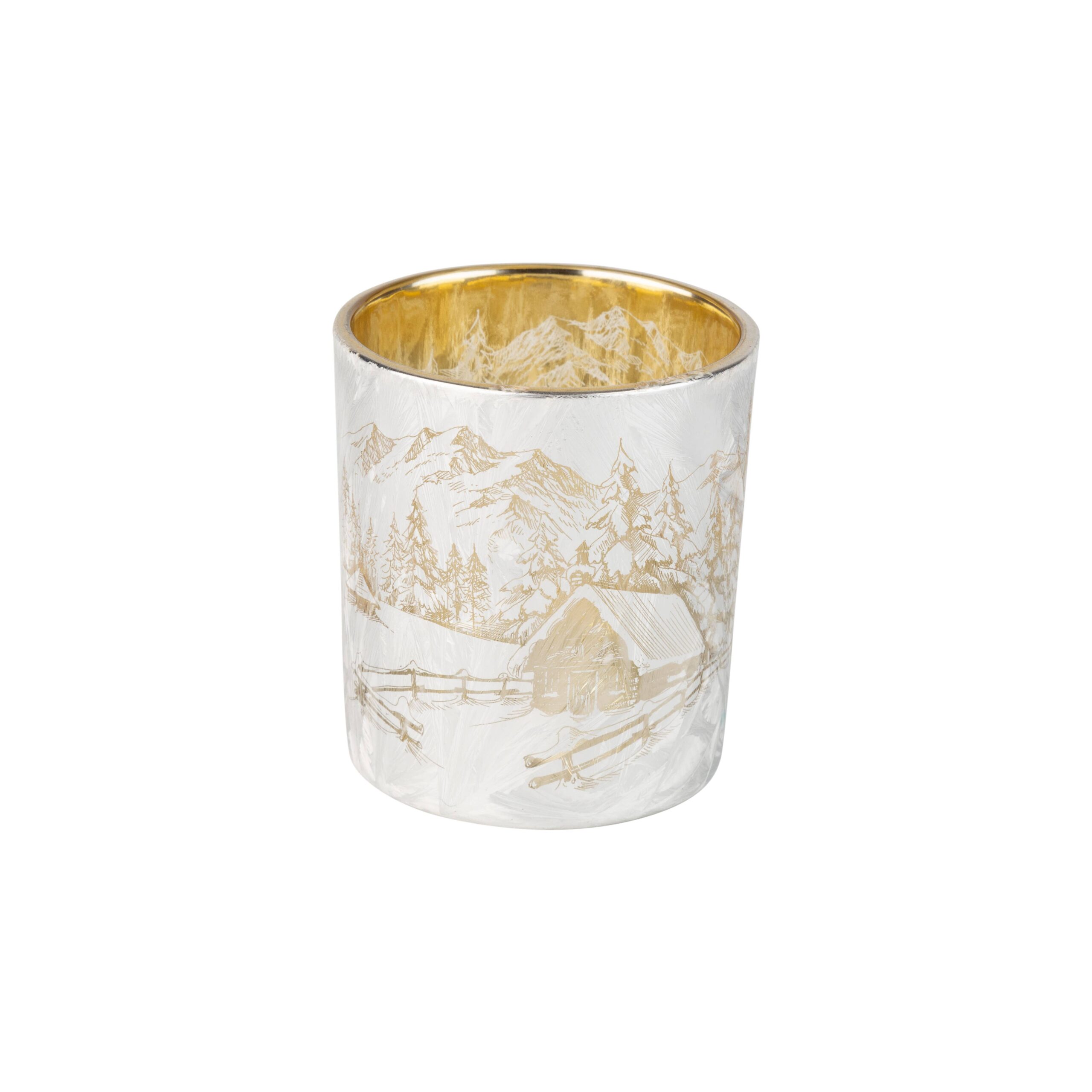Glass t-light holder, frosted silver cabin in the woods, gold interior, 3 in. The price listed is PER item, with a minimum purchase quantity of 12 items. While we aim for consistency, there may be slight variations in color between the product and the images provided, as well as among individual items. However, we take steps to ensure that these differences remain minimal. MATERIAL: Glass