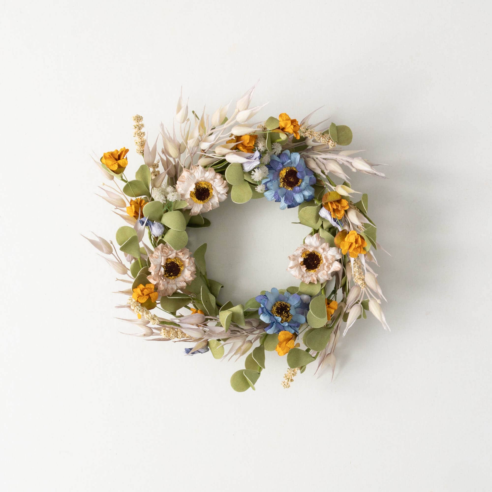This whimsical floral accent ring is perfect for adding a pop of color to your decor. Use it to bring in the spring or leave it on display to keep a bit of summer year-round. The soft blues and oranges of this mini wreath will elevate any mantel, tabletop, or door.