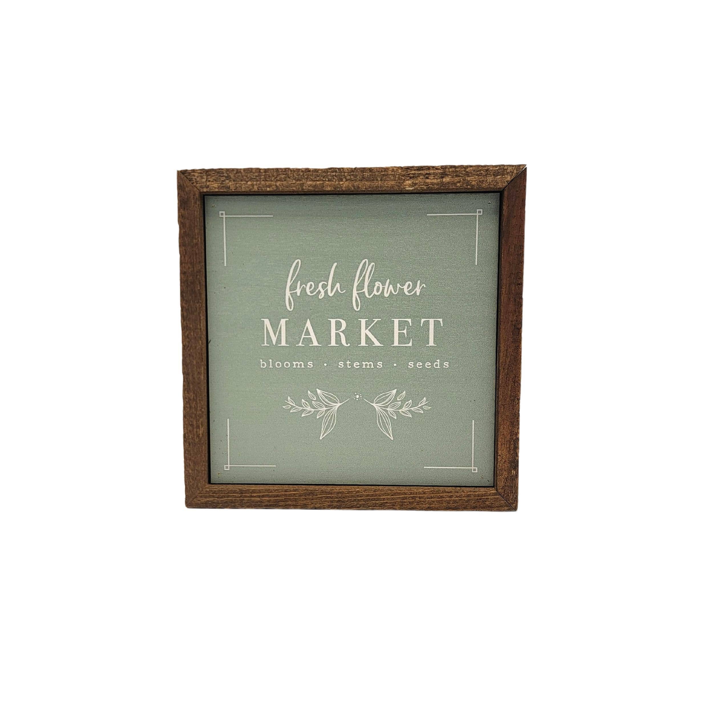 Fresh Flower Market. All our signs are build into a wooden box frame with a rustic touch. We strive to mix the perfect blend of rustic and modern styles that will last for years. All of our signs can be easily hung directly off of the frame or will stand upright on shelves or desks.
